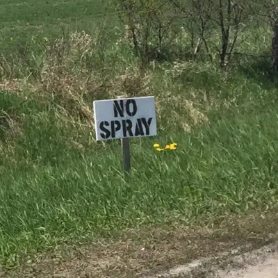 Property owners can erect “No Spray” signs at the start and finish of their properties if they do not want the right-of-way sprayed in front of their property. The dimensions of the sign must be one foot by two feet and the sign must be placed approximately three feet from the edge of the gravel shoulder. The signs must be easily visible, at least one foot above the vegetation and at the start and finish of the property.