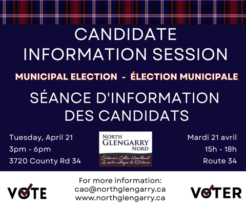 The Township of North Glengarry will be hosting an information session for interested candidates for the 2026 Municipal Election. Interested candidates will be able to ask questions, learn more about the roles, and pick up a nomination package. Please see event details below.