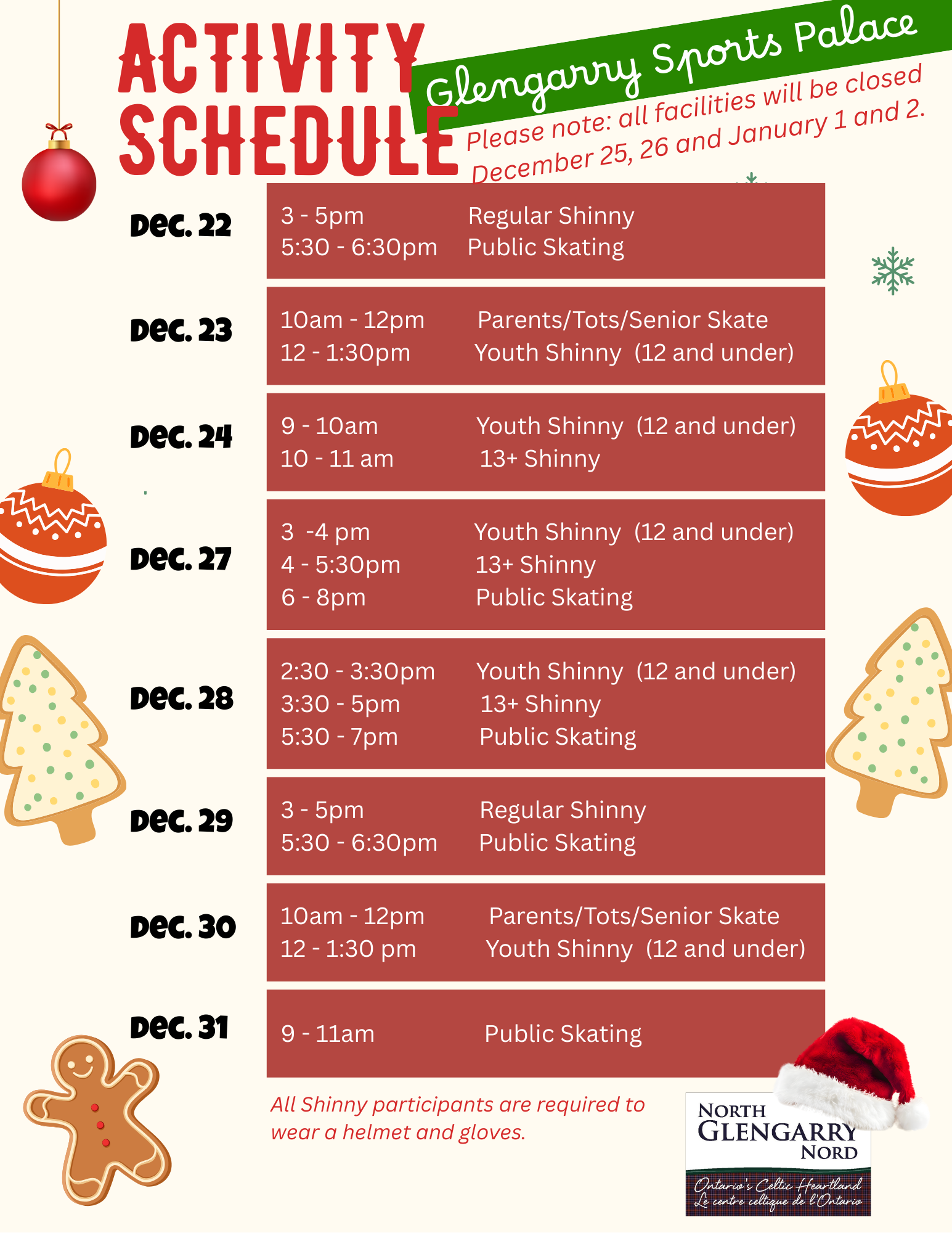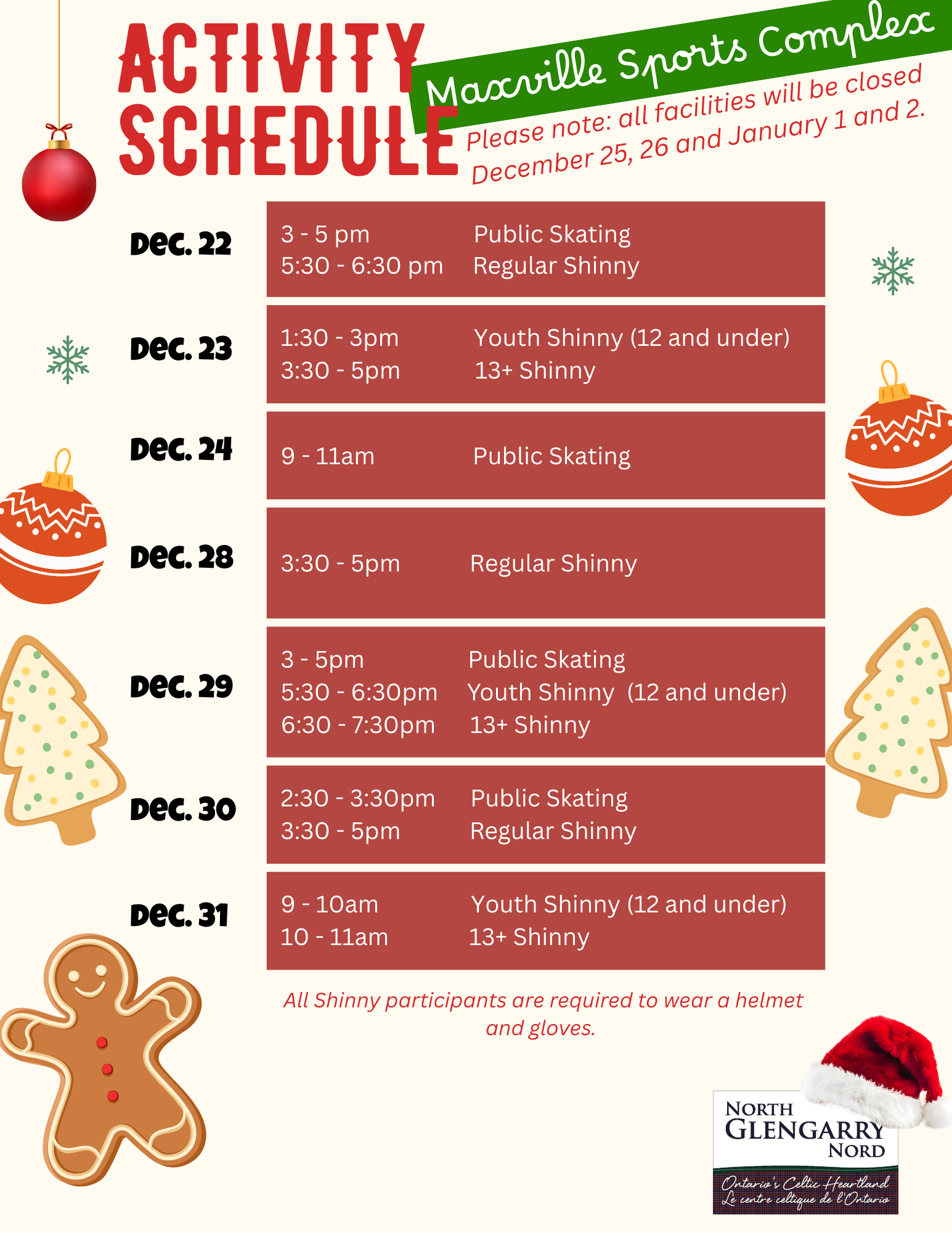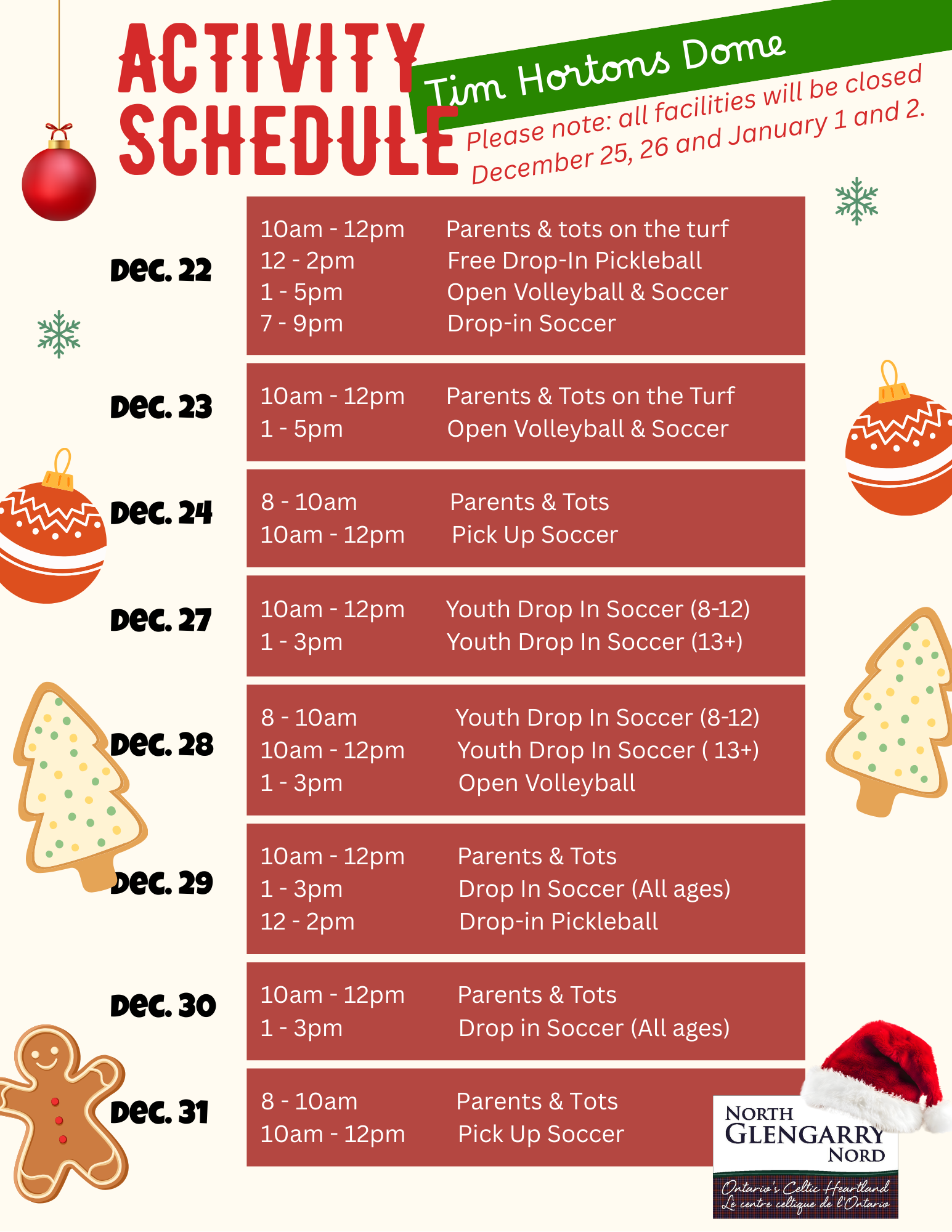Please note that all facilities will be closed December 25, December 26 and January 1 and January 2.